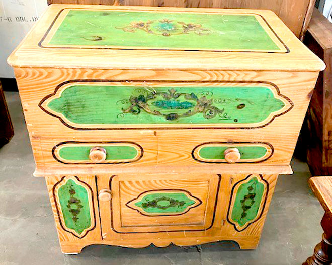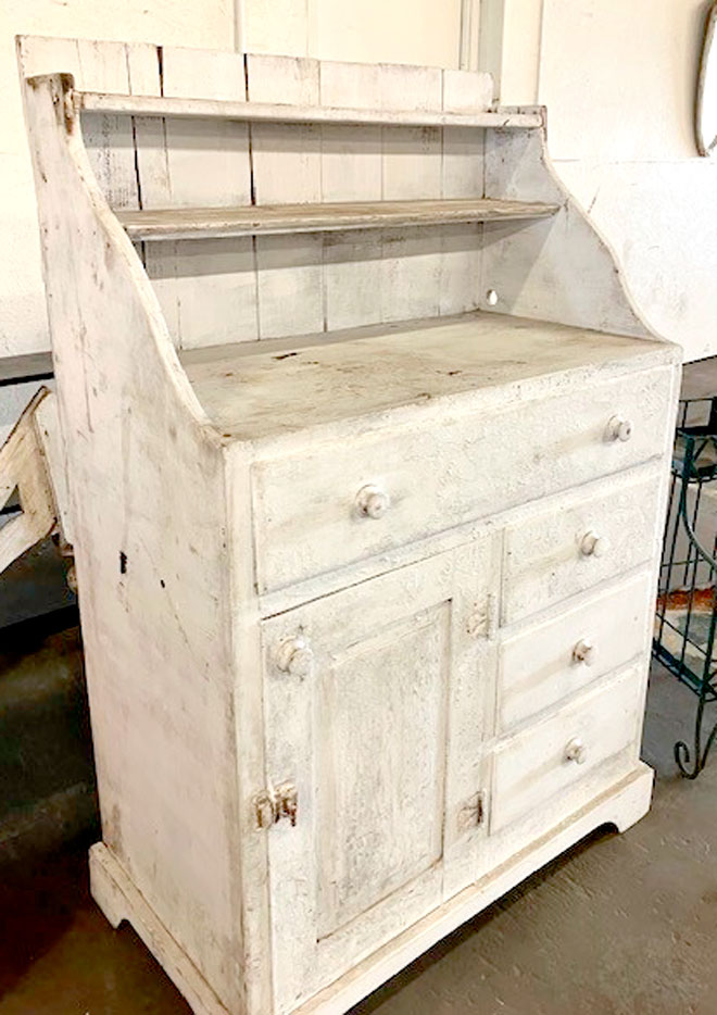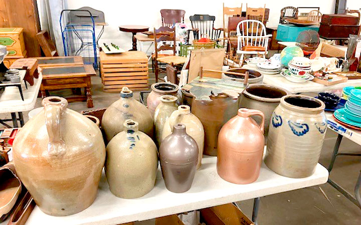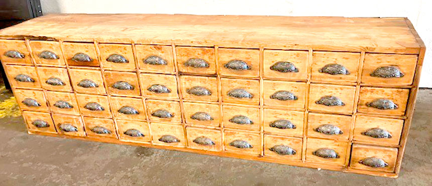 Super Nice Primitive 40-Drawer 21" Tall Wooden Hardware Cabinet; Early Primitive Painted Work Cabinet with Splashback; Early Circa 1880s School House Desk; Numerous and Various Painted Pieces; Small Dry Sink; Type Of Hardware Cabinet with Drawers, Doors, Splashback; Very Nice Metal Bankers' Cabinet; 2-Piece Oak Step Back Primitive Cupboard; Queen Anne Legged 2-Glass-Doored China Cabinet with Drawer Below Corner Cabinet, Painted; Empire Style 4-Drawer Chest of Drawers with Double Top Hankie Boxes; Adirondack Chairs; Varied Corner Cupboards; Very Nice Adirondack/Twig Childs' Rocker; Varied Other Childrens' Kitchen Cupboards; Extremely Ornate Hall Tree with Umbrella Stand; - Unusual Painted Commode Type with Slatted Top; Varied Jelly Cabinets; Varied Pie Cabinets; Other Hall Trees; Open Shelving; Numerous Metal and Wood Beds; Numerous and Various Oak and Painted Commodes; Small Slant-Top Primitive Desk; Old 36" Wicker Pedestal Table; Oak Stroller High Chair with Iron Legs; Large Amount of Varied Chairs Including: Ladderback, Cane Bottom, Reed Bottom; Yard Art (Lots of it); Patio Chairs; Varied Trunks of All Sizes; Kamm's Beer Mug; Many Other Painted Stands and Tables; Painted Pine Commode, Lift Top; Old Wardrobes; Cast Iron Urns; Baskets; All Types of Quilts, Hand Sewn Doilies, Blankets and Fabric; Approximately 25 Salt Glaze Blue Crocks and Jugs; Old Pewter; Older Childrens' Toys; Childrens' Stoves; Lots of Gaudy Welch and Dutch Plates; Many Pieces of Fiestaware; Varied Cast Iron Banks, Lions, Elephants, Horses and More; Bookends; Lots of Sleigh Bells; Stoneware Bowls; Varied Vintage Christmas Decorations; Halloween Vintage Decorations; Pictures, Prints, Oils, Etc.; Graniteware; Rolling Shoe Stand; Marble Top Stand; Lots of Stone and Wooden Fruit; Small Primitive Roulette Table; Small Corona Typewriter, Manual; Paperweights; Wooden Bowls; Early Wooden Hobby Horse and Others; Wooden Tote; Varied Victorian Round Tables; Marble Top Stands; Beaded Purses; Skookum Dolls; Childrens' Moccasins; Lots of Copper; Lots of Graniteware, Varied Colors; Numerous Old Dutch Wooden Shoes; Lightning Rod Balls; Lots of Globes; Varied Wooden Ships; Copper Luster; Pearl Opera Glasses;