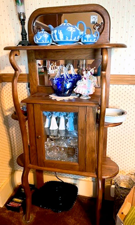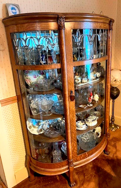 Gorgeous Quartersawn Oak Claw Footed Leaded Top Curve Glass China Cupboard; Other Old Oak China Cupboards; Real Nice Étagre with Mirrored Back, Glass Doored Cabinet Below; Very Fancy Dog Head Round Oak Dining Table 2 Oak Leaves; Varied Cane Bottom Chairs; Brass Hanging with Milk Glass Shade Kerosene Light; Beautiful Oak Commode, Victorian, with Splash Back; Lovely Claw Footed Double Pedastal Quartersawn Oak Library Table with Drawer; Tiered Caramel Slag Lamb and Greene Nappanee Shade with Red and Green and Brass Stand; Very Fancy Walnut Victorian White Marble Topped Parlor Stand; Brass Fireplace Screen; Fancy Early Jardiniere with Stand; Super Nice Caramel Slag, Could Be Lamb and Greene, 15" Domed Shade Leaded Light with Red Leading On Bottom and Acorn Pulls; Clarks 2-Drawer Spool Cabinet; Burled Walnut 3-Drawer Fruit Pull Chest of Drawers with Extremely Fancy Mirrored Back; Brass Early Single Bed with Mattress and Springs; Victorian Walnut Cane Bottom and Back Sewing Rocker; 4' Walnut Front Bookcase; Old Plymouth Hallow Walnut Weight Clock; Marble Top Oval Occasional Stand; Brass School Bell; Brass Doll Bed; Globe; Old Gray Painted Bucket Bench Type Shoe Shelf 32" Wide; Misc. Old Books Including Bopsy Twins and Others; Primitive Old Thread Rewinder with Bobbins; Misc. Walnut Stands; Plant Stands; End Tables; Misc. Small Electrical Appliances; Kitchenwares; Utensils; Pots and Pans; Ordinary Kitchen Dishes; Nice 5 Light Porcelain Dining Table Light; 16' Aluminum Extension Ladder; Wooden Step Ladders; Large Porch Independence Banner; Sutter Oak Kitchen Cabinet Top with 3 Frosted and Slag Doors; Portable Air Compressor; Small Toolbox; Misc. Hand Tools; Misc. Lawn and Garden Hand Tools