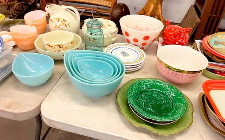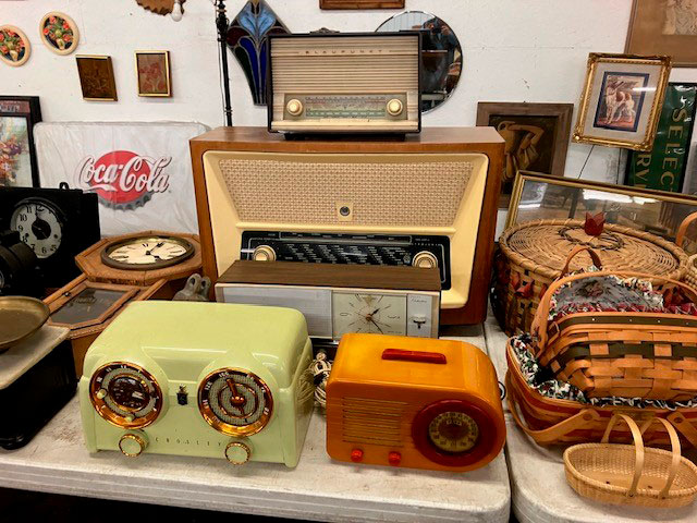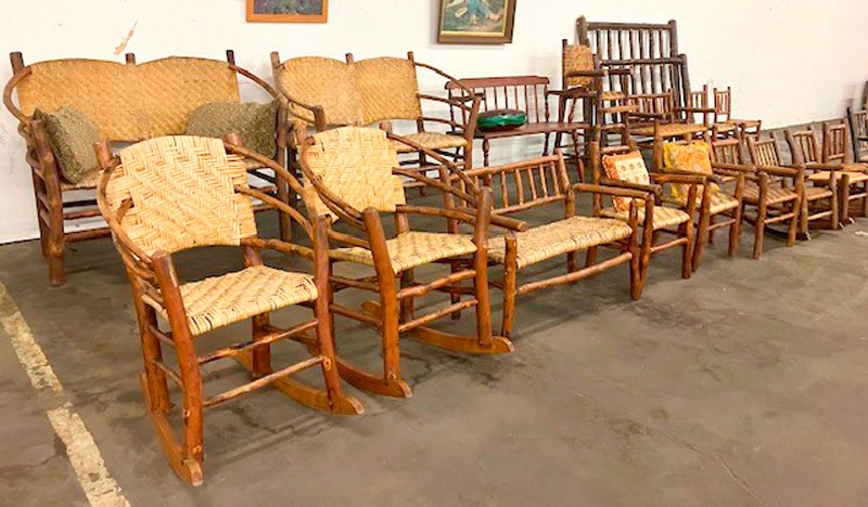 Approximately 35 pieces of Adirondack furniture, reed bottom and back some, tables, armchairs, rockers, bed, high chairs, children's love seat, adult love seat, children's rockers and chairs; Adirondack hall trees; Wood tree stump tables and foot stools; Huge amount of artwork, pictures and frames; Dining chairs; Solid oak five leg dining table w/leaves; Very nice claw-footed oak curve glass china cupboard; 1920s step back cross paned cupboard, 2 piece; Child's zinc top kitchen cabinet, replica of a full-sized zinc tray that we are selling full size one that has zinc base early vintage oak; Étagre mirrored multishelf stand; Cedar chest- many varied stands; Blanket chest; Edison phonograph, console floor model; Very nice mission-style oak library table; Clark's 6-drawers spool cabinet; Crowleys' Needles box with porcelain pulls; Clark's 2-drawer spool cabinet; Regina 15" disc music box, works; Other varied music boxes; Clocks; dough tray tub; Early Art Deco radios, Crosley, Fada in bakelite and others; Fluted large bulbous quilted pink opalescent table light; Early leaded table light, no stand and many other lamps; Advertising plates; Cups, saucers, pottery, glass, decorative; Jewel Tea varied colored Pyrex nest bowls - Jadeite pieces; Old advertising metal serving trays; Spatterware, spittoons; Numerous children's toys, cradles, clothes; Some advertising, calendars, and signs; 20 gal. Western crock; 100 varied advertising yardsticks; Fireplace screens; Beautiful blue porcelain Strueler Elkhart, Indiana produce scales; Dayton produce scales; Electric wall hung barber pole; Numerous baskets; Lot of reference books; Varied sleigh bells; Buggy blankets; Kerosene lamps including railroad lanterns; Selective service 32" sign; Large amount of varied quilts; Comforters; Rag rugs; Hand sewn linens; Chenille bedspreads; Varied decoys; Large amount of jewelry, primarily costume; Old magazines; Old picture albums; Varied political items; Trays full of jewelry; Advertising items; Misc. toys; Matchbox toys; Tramp art; Shawnee dog and cat cookie jars with salt and pepper; Vintage toaster; Weller and Hull pottery; Early child's miniature wood burning cook stove; Misc. brass; Misc. copper; Large amount of piano babies; Milk bottles; Marbles; Aluminum ware; Collection of cast iron and pottery pig banks; Collection of matches; Set of Time Life Western books; Hand painted milk glass; Collection of black babies; Over 40 tables full of items; Something here for everyone, toys, fabric, music machine, furniture, jewelry and so much more!