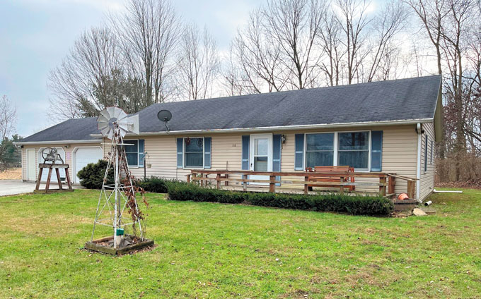 1,400 sq. ft. house, 2-car garage, 3.5 acres, nearly all wooded, washer, dryer, stove, refrigerator and microwave included. House is on a crawl space. 1.5 baths, 3 bedrooms, eatin kitchen. Great setting close to Dewart Lake.