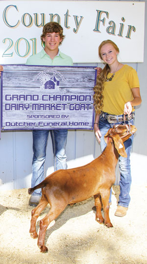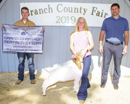 The grand champion dairy breed goat, shown by Bailey Miller of Coldwater, was sold for $300 to Swift and Skidmore. The reserve champion dairy wether was exhibited by Olivia Davenport of Coldwater and was auctioned for $500 to Parrish Excavating Inc.